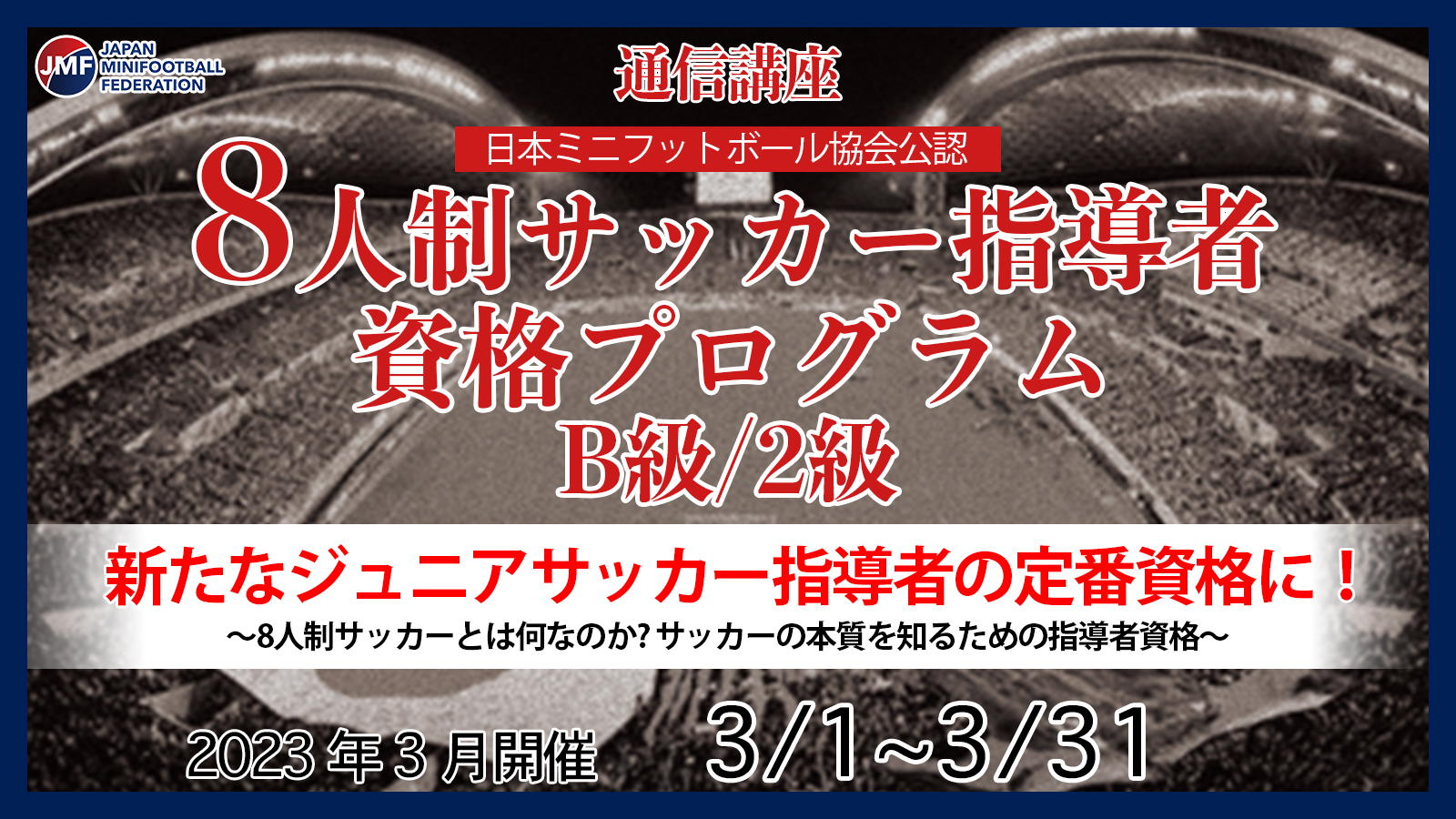 世界ミニフットボール連盟の認可を受け設立された日本ミニフットボール協会(JMF)公認。 サッカー指導者を対象に「B級/2級資格」取得を目的とする資格取得講座です。